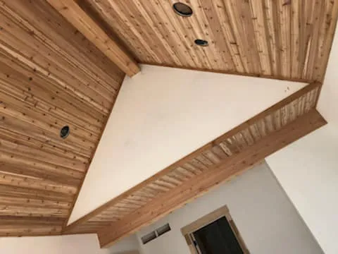 Tall, Home Wood Ceiling with Recessed Light Fixtures